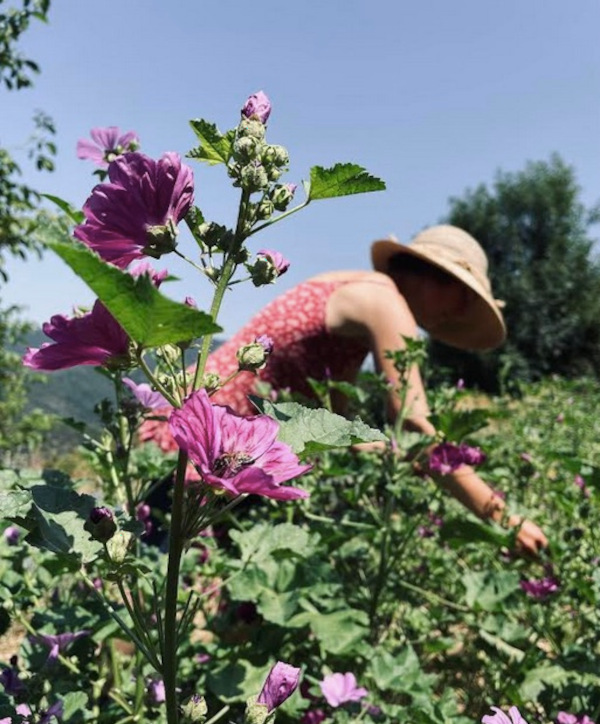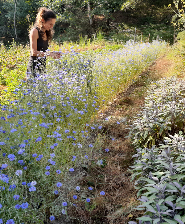 Installée depuis peu, elle cultive un jardin de mauves, bleuets, géraniums, roses, avoine… Elle cueille aussi des sauvages : thym, laurier, lavande, primevères, alchémille…